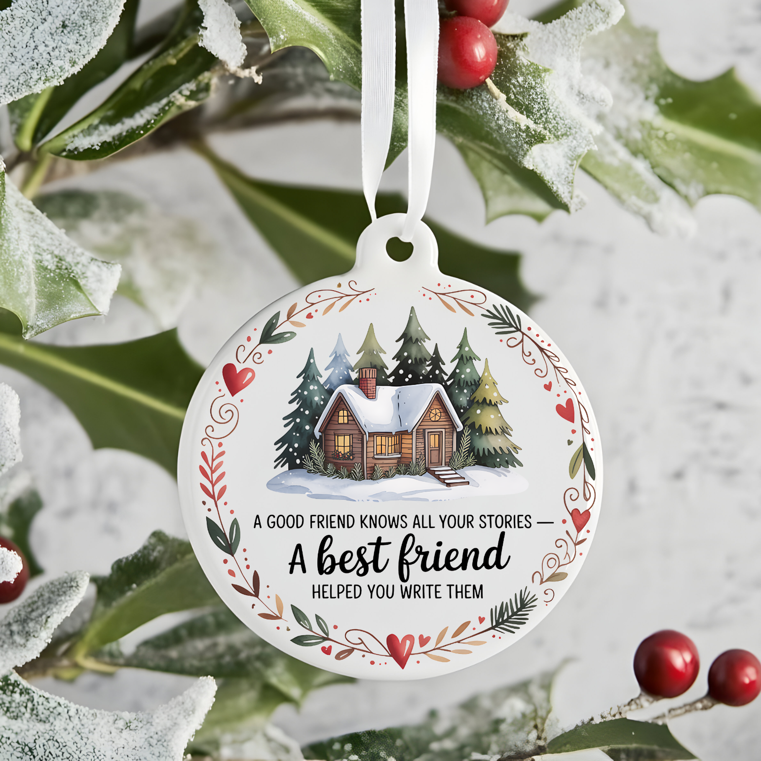 Celebrate the magic of friendship this holiday season with our Best Friend Ornament, featuring a cozy snow-covered cabin nestled in a pine forest, surrounded by hearts and rustic winter florals. The heartfelt message reads: “A good friend knows all your stories – A best friend helped you write them.” It’s a meaningful reminder of memories shared and laughter echoed.