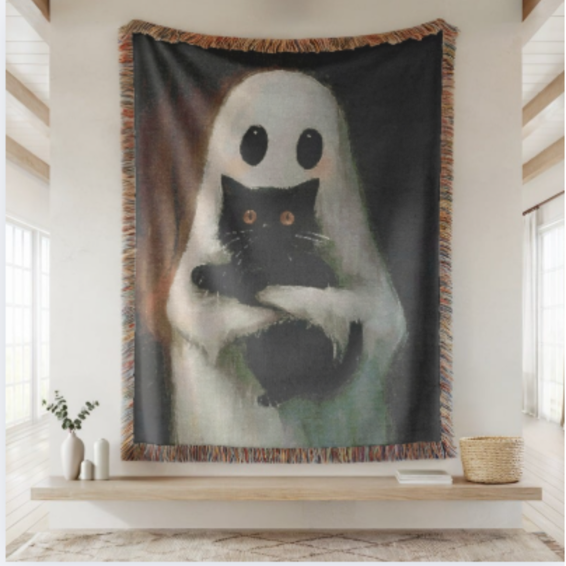 Ghost Hug Blanket with Black Cat – Halloween Cozy Throw