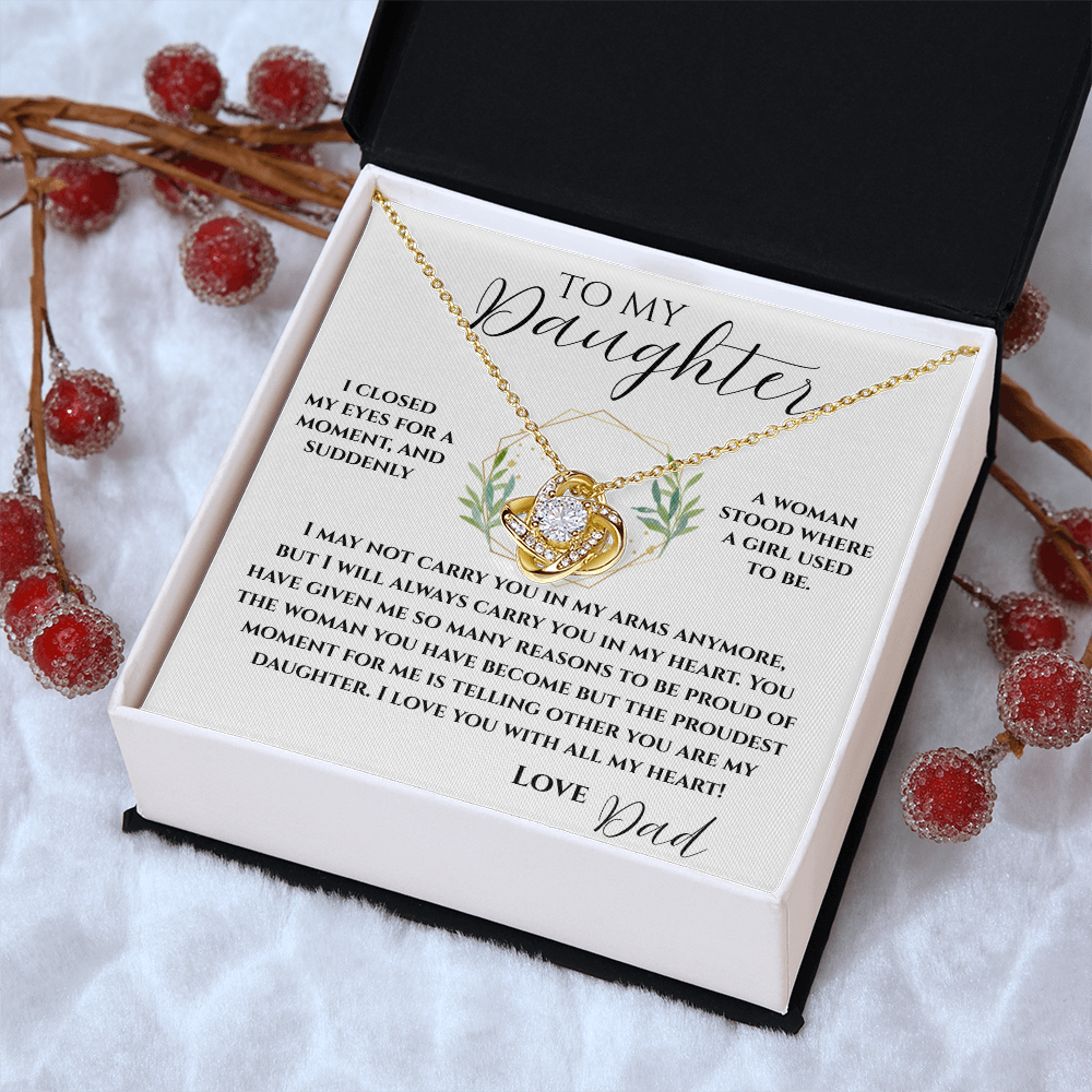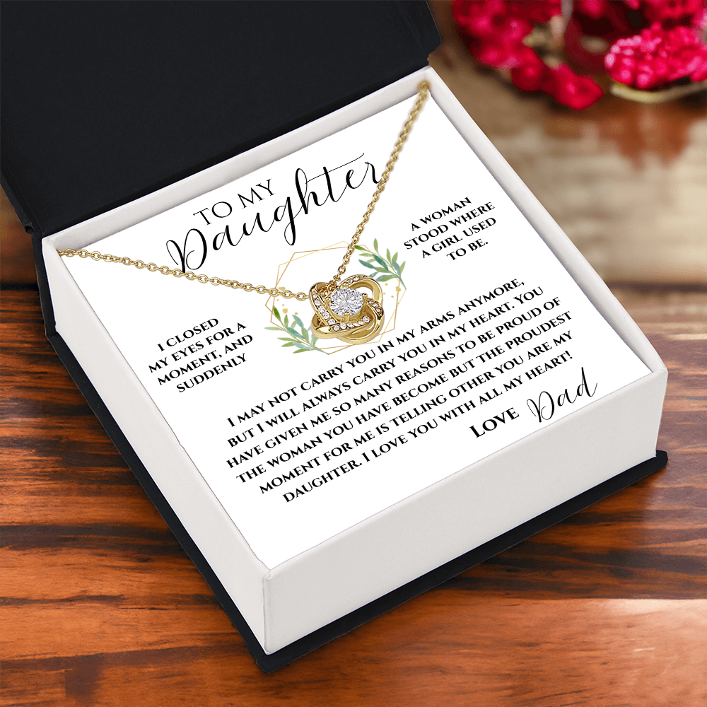 MESSAGE SAYS: TO MY DAUGHTER I CLOSED MY EYES FOR A MOMENT, AND SUDDENLY A WOMAN STOOD WHERE A GIRL USED TO BE. I MAY NOT CARRY YOU IN MY ARMS ANYMORE, BUT I WILL ALWAYS CARRY YOU IN MY HEART. YOU HAVE GIVEN ME SO MANY REASONS TO BE PROUD OF THE WOMAN YOU HAVE BECOME BUT THE PROUDEST MOMENT FOR ME IS TELLING OTHER YOU ARE MY